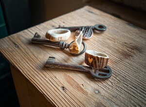 Cravattini, spille e accessori ricavati dall'incisione e fresatura di sezioni di palchi caduchi dei vari ungulati che popolano i nostri boschi.